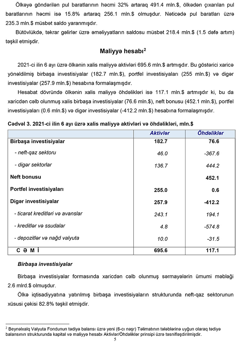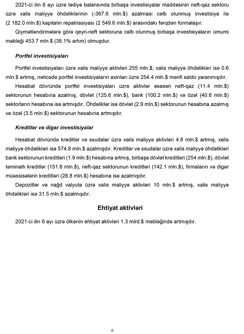 Marja-nın məlumatına görə, 2021-ci ilin 6 ayı üzrə Azərbaycan Respublikasının Tədiyyə balansında bildirilir ki, 2021-ci ilin 1-ci yarımilliyində tədiyə balansı əsasən qlobal əmtəə bazarlarında qiymətlərin bərpası və qeyri-neft ixracının genişlənməsindən təsirlənmişdir. Cari əməliyyatlar balansında 1.9 milyard dollarlıq profisit, kapital və maliyyənin hərəkəti hesabında isə 0.6 milyard dollarlıq kəsir yaranmış, ehtiyat aktivləri 1.3 milyard dollar artmışdır. Bu dövrdə xam neftin orta qiyməti 58 dollar/barel olmuş, qeyri-neft ixracı isə 20% artmışdır.
