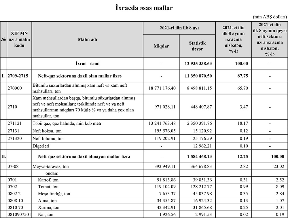 2021-ci ilin yanvar-avqust aylarında Azərbaycanın ən çox ixrac və idxal etdiyi mallar açıqlanıb.