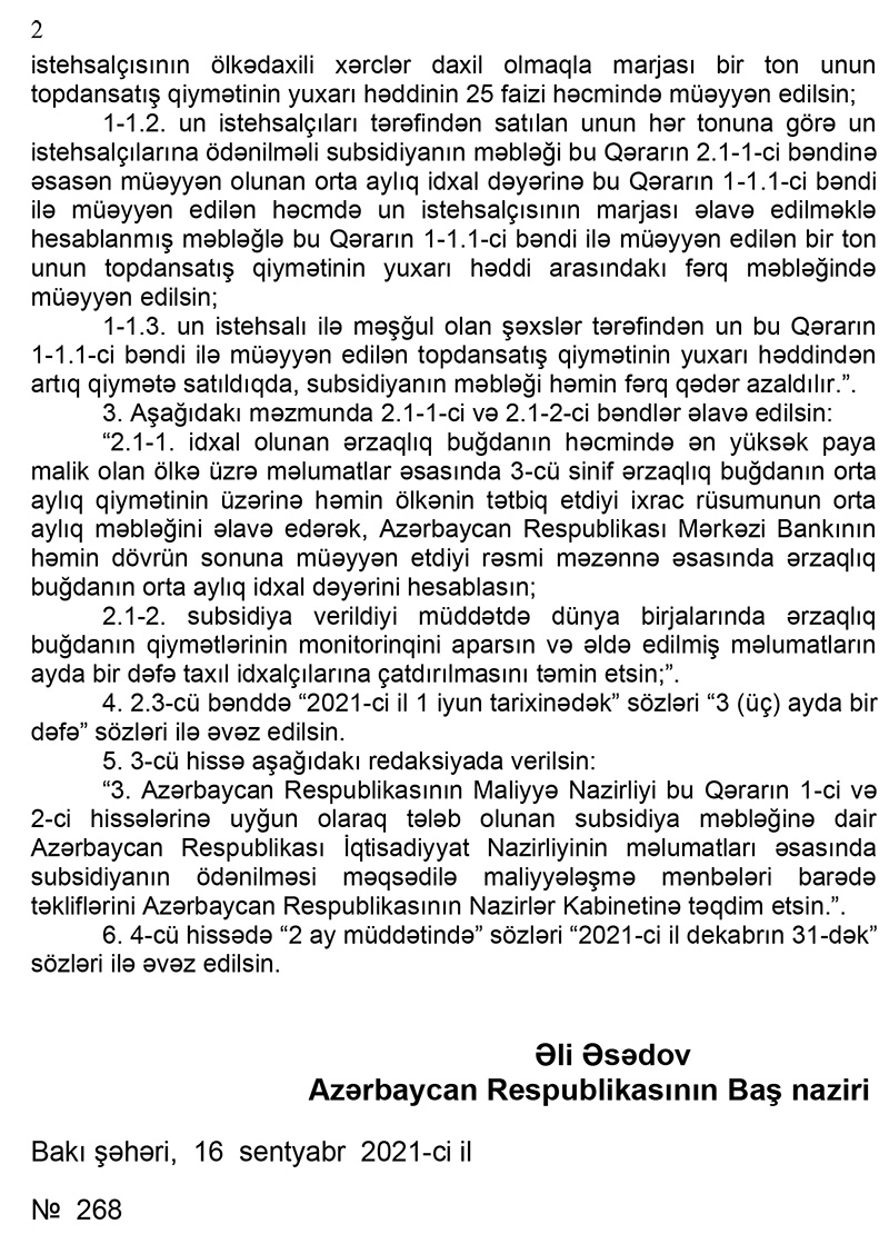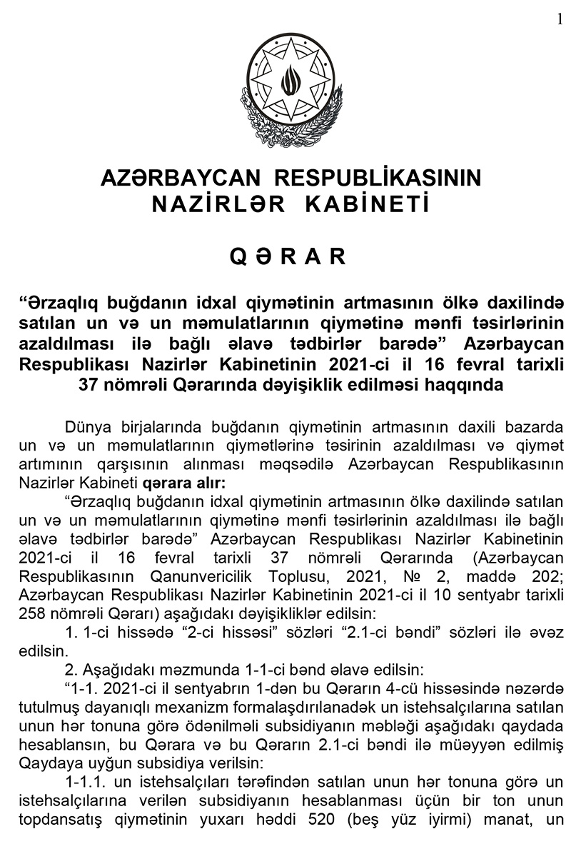 Bu, Nazirlər Kabinetinin “Ərzaqlıq buğdanın idxal qiymətinin artmasının ölkə daxilində satılan un və un məmulatlarının qiymətinə mənfi təsirlərinin azaldılması ilə bağlı əlavə tədbirlər barədə” 16 fevral 2021-ci il tarixli qərarına edilmiş dəyişiklikdə öz əksini tapıb.