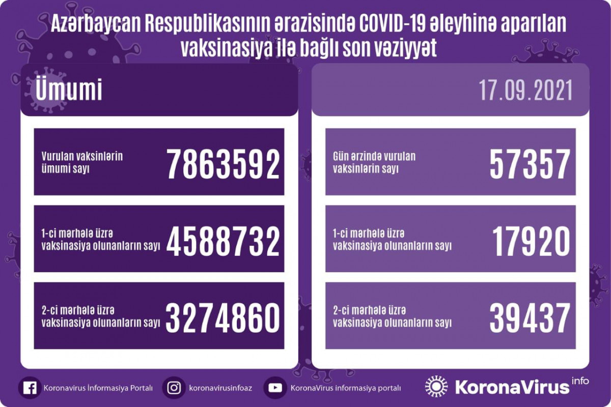 Bir gündə birinci mərhələ üzrə vaksinasiya olunanların sayı 17920, ikinci mərhələ üzrə vaksinasiya olunanların sayı 39437 nəfərdir.