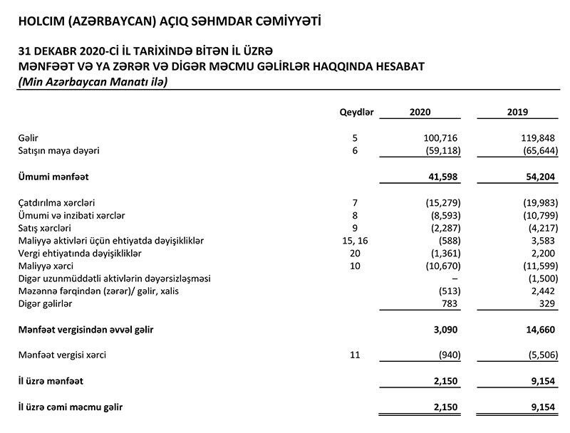 Müqayisə üçün qeyd edək ki, 2019-cu ildə “Holcim Azərbaycan”ın cəmi gəlirləri 128 milyon 402 min manat, cəmi xərcləri isə 119 milyon 248 min manat təşkil etmişdi. 2019-cu ildə “Holcim Azərbaycan” məzənnə fərqi üzrə, maliyyə aktivləri üzrə ehtiyatlarda dəyişikliklərdən və vergi ehtiyatında dəyişikliklər üzrə də gəlirlər əldə etmişdi. 2020-ci ildə bu gəlirlər olmayıb.