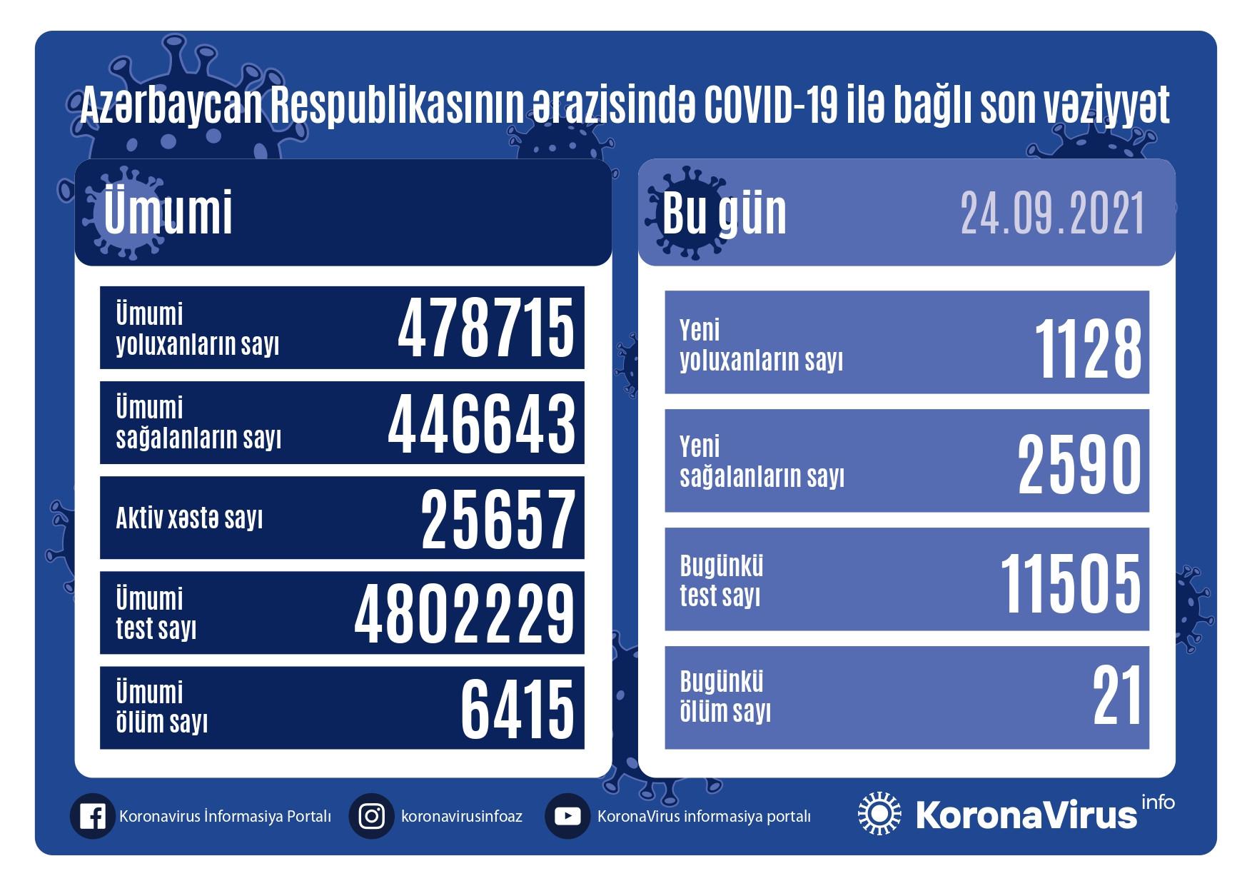 Azərbaycan Respublikasında koronavirus (COVID-19) infeksiyasına 1128 yeni yoluxma faktı qeydə alınıb, 2590 nəfər müalicə olunaraq sağalıb.