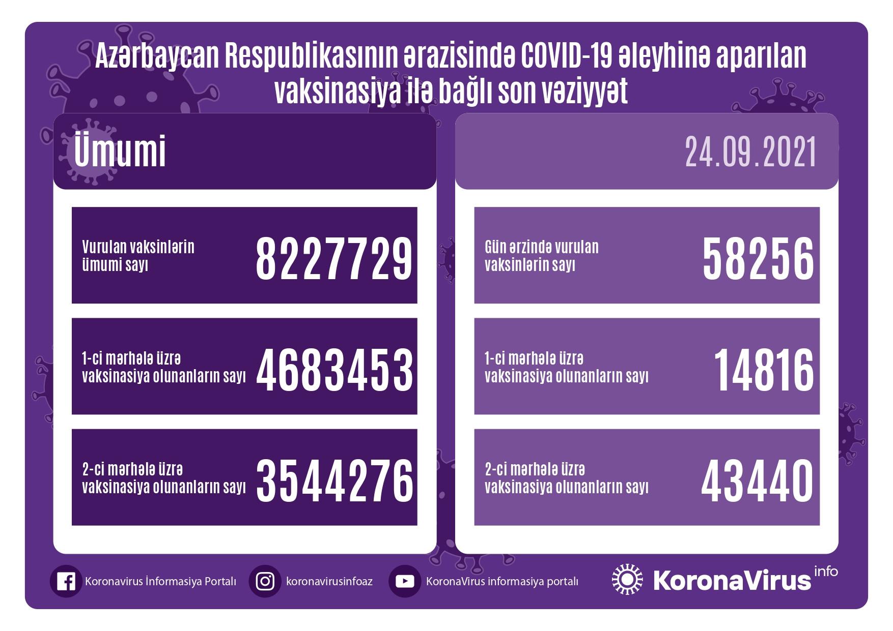 Azərbaycanda son sutkada koronavirus (COVID-19) əleyhinə 58256 vaksin vurulub.