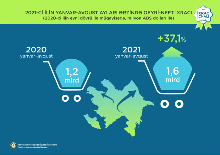 Normallaşma prosesinin davam etdiyi dövrdə avqust ayı üzrə ixrac 1,6 mlrd ABŞ dolları təşkil edib. Qeyri-neft sektoru üzrə ixracda artım 95,3% təşkil etməklə 230,4 mln ABŞ dolları olub. 2021-ci ilin avqust ayı ərzində yeyinti məhsulları üzrə ixrac ötən ilin müvafiq ayı ilə müqayisədə 53,1% artaraq 38,3 milyon ABŞ dolları, qeyri-yeyinti məhsulları üzrə isə 106,6% artaraq 192,1 milyon ABŞ dolları təşkil edib.