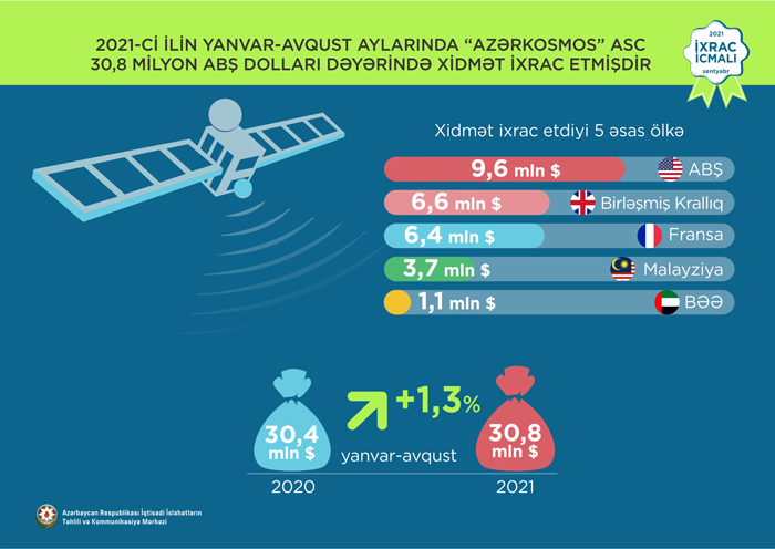İcmalda qeyd edilib ki. 2021-ci ilin yanvar-avqust aylarında “Azərkosmos” ASC tərəfindən dünyanın 31 ölkəsinə 30,8 milyon ABŞ dolları dəyərində xidmət (peyk telekommunikasiya xidmətləri və optik peyk xidmətləri) ixrac edilib.