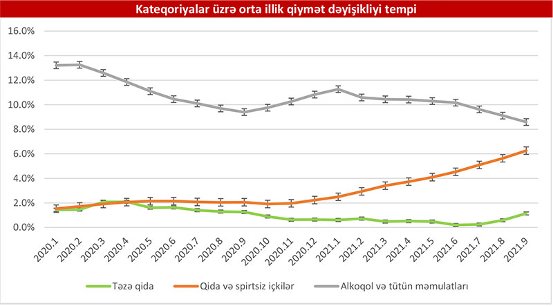 “Veysəloğlu Pərakəndə İndeksi”nə daxil edilən məhsulların qiymətində 2021-ci ilin sentyabr ayında 2020-ci ilin sentyabr ayı ilə müqayisədə 7,7% artım müşahidə edilir. Belə ki, cari ilin sentyabr ayında ötən ilin sentyabr ayı ilə müqayisədə təzə qida məhsullarında (qısa müddətli istifadəyə yararlı istehlak məhsulları) 6,7%, qida və spirtsiz içkilərdə 9,5%, alkoqol və tütün məmulatlarında isə 5,8% artım olub.