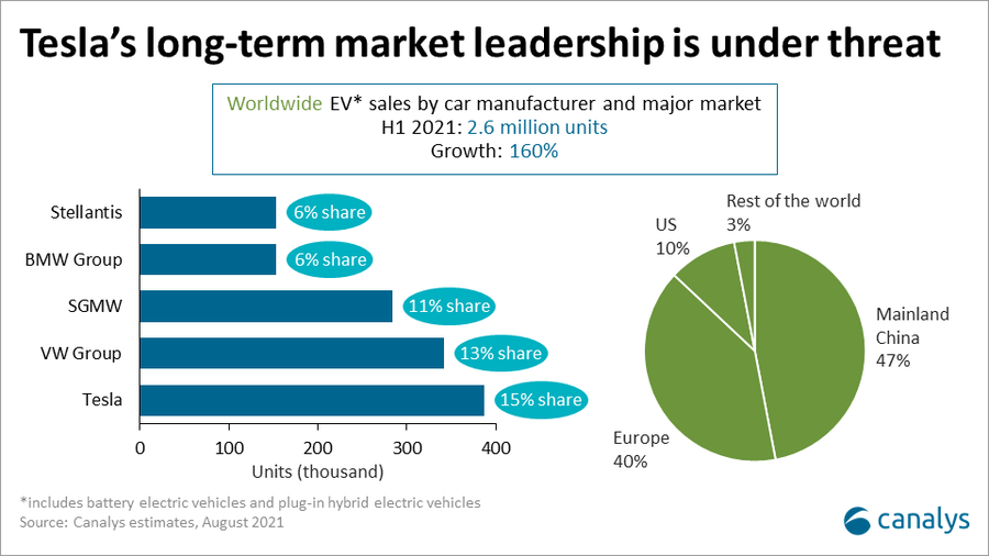 Elon Maskın şirkəti bazarda ən iri payçıdır - 15%. İkinci ən böyük oyunçu Volkswagen-dir (13%). Sonrakı yerləri SAIC, General Motors və Wuling-in birləşməsi olan SGMW (11%), BMW (6%) və Stellantis (6%) tutur. Xüsusən Çin şirkətləri - Nio, Xpeng, Li Auto ucuz modellər təklfi edir, bu isə Teslanın Çin bazarındakı mövqeyinə ən iri potensial təhlükədir.