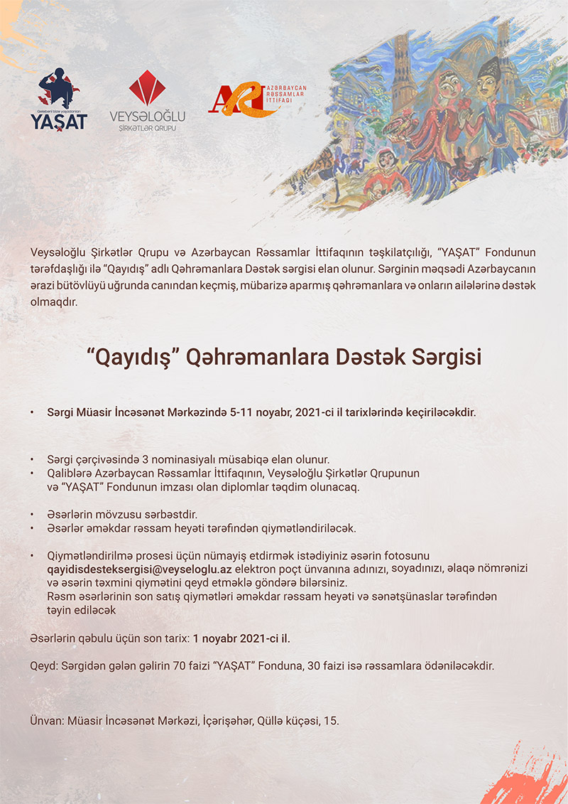 Veysəloğlu Şirkətlər Qrupu, Azərbaycan Rəssamlar İttifaqının təşkilatçılığı və “YAŞAT” Fondunun tərəfdaşlığı ilə 5-11 noyabr 2021-ci il tarixlərində “Qayıdış” adlı Qəhrəmanlara Dəstək sərgisi təşkil olunacaq.