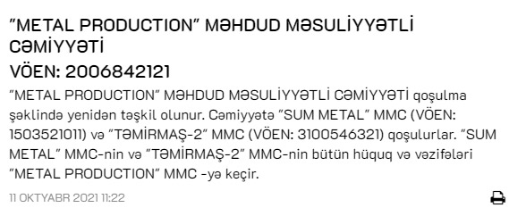 Marja xəbər veri ki, buna səbəb "Sum Metal" MMC və "Təmirmaş-2" MMC şirkətlərinin "Metal Production" şirkətinə qoşulmasıdır.