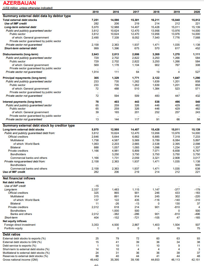 Dünya Bankının hesabatına əsasən, Azərbaycanın xarici borcu son 10 ildə ikiqat artıb. 2010-cu ildə bütün mənbələrdən cəlb edilən xarici borcun həcmi 7 milyard 251 milyon dollar idisə, 2020-ci ilin sonuna bu rəqəm 15 milyard 812 milyon dollar təşkil edib. Ölkənin uzunmüddətli borc öhdəlikləri 15 milyard 139 milyon dollardır. Dövlət zəmanəti ilə götürülən borcların həcmi 14 milyard dollara çatıb.