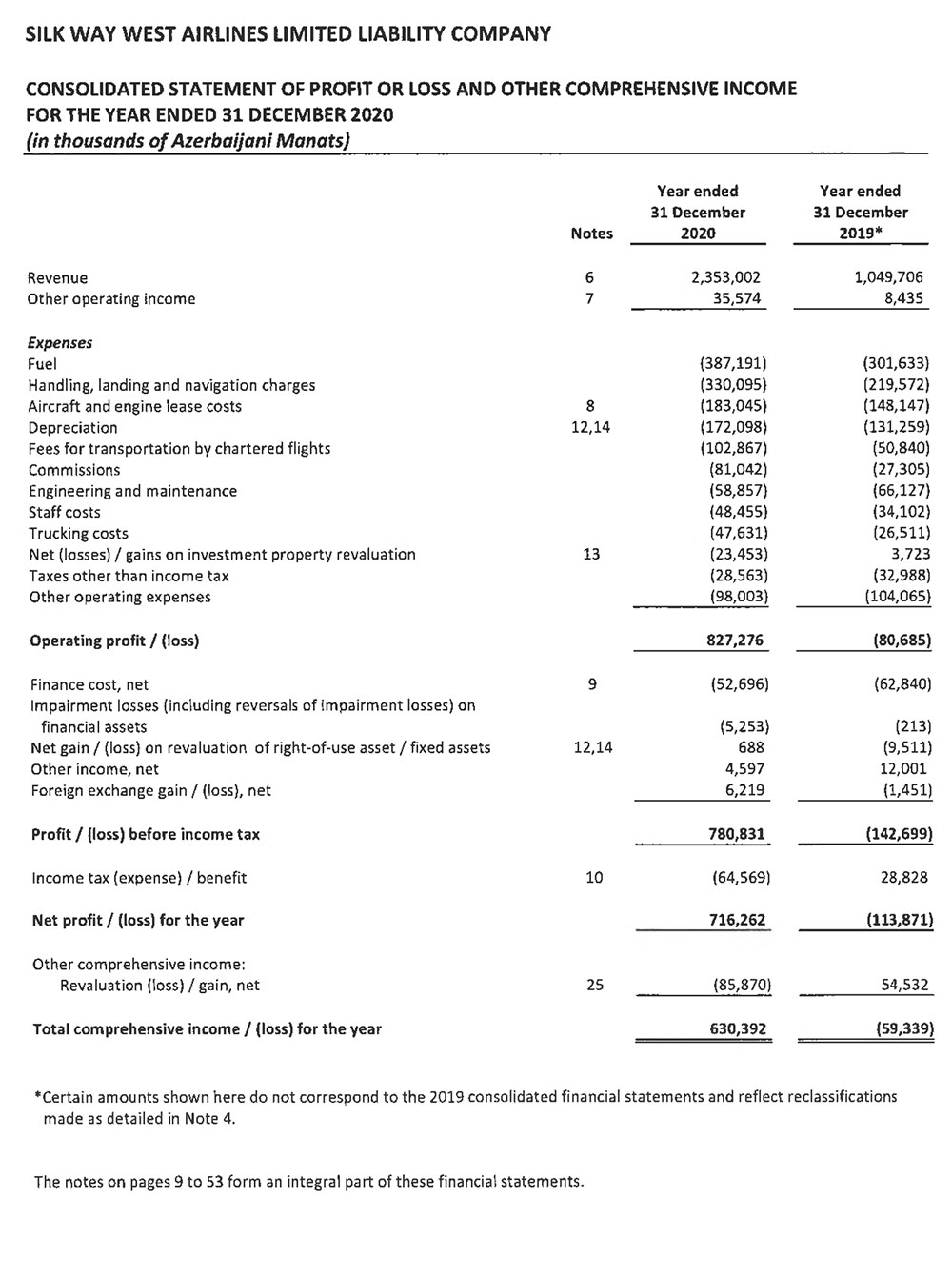 Pandemiya ilin “Silk Vey Vest Aviaşirkəti”nin cəmi gəlirləri 2,2 dəfə artaraq 2 milyard 350 milyon manatı aşıb.“Silk Vey Vest Aviaşirkəti” MMC 2020-ci ili 716 milyon 262 min xalis mənfəət ilə başa vurub. Halbuki, şirkət 2019-cu ili 113 milyon 871 min manat xalis zərər ilə bağlamışdı.