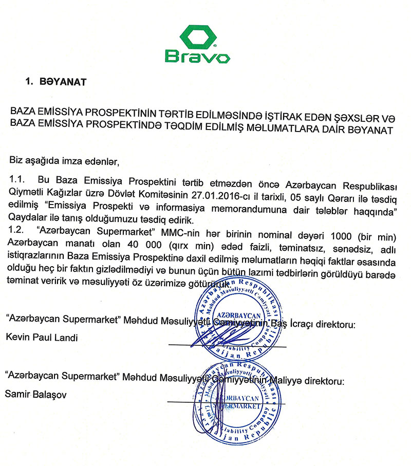"Azərbaycan Supermarket" MMC 40 milyon manatlıq istiqraz buraxır. İstiqrazlar üzrə kupon gəlirliyi illik 10.5 faiz təşkil edir."Bravo" marketlər şəbəkəsini idarə edən "Azərbaycan Supermarket" MMC istiqraz buraxılışı yolu ilə 40 milyon manat cəlb etməyi nəzərədə tutur.