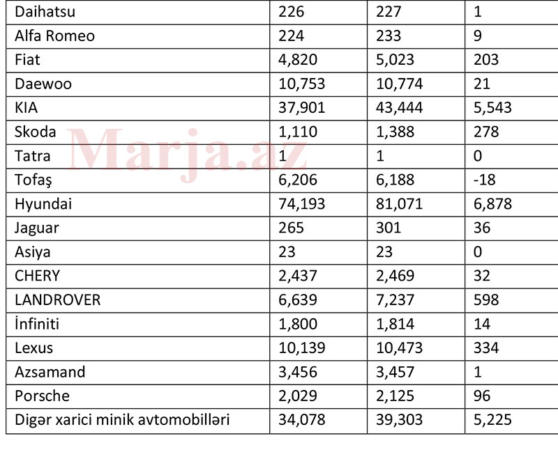Minik avtomobillərin markaları üzrə sayları və dəyişikliklər ilə aşağıdakı cədvəldən ətraflı tanış ola bilərsiniz.