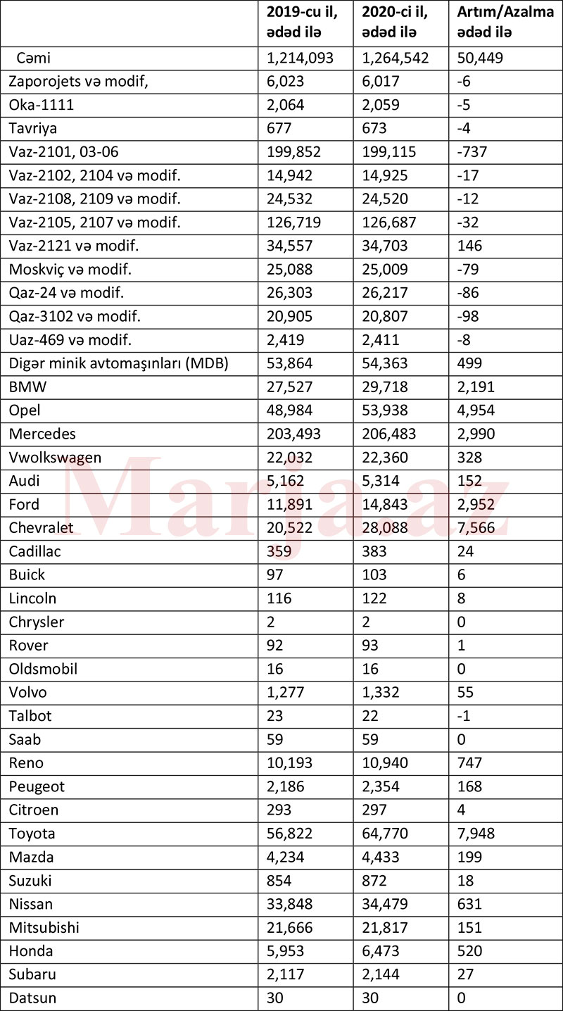 2019-ci illə müqayisədə 2020-ci ildə Azərbaycanda ən çox Toyota (+7,948), Chevrolet (+7,566), Hyundai (+6,878), KİA (+5,543), Opel (+4,954), Mercedes (+2,990), Ford (+2,952) və BMW (+2,191) markalı avtomobillər artıb.