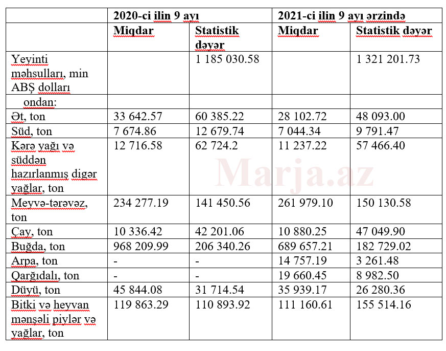 Marja Dövlət Gömrük komitəsinə istinadən xəbər verir ki, 2020-ci ilin 9 ayı ilə müqayisədə 2021-ci ilin 9 ayı ərzində statistik dəyər baxımdan ət, süd, kərə yağı, buğda, düyü idxalı azalıb, meyvə-tərəvəz, çay, bitki yağları idxalı artıb.
