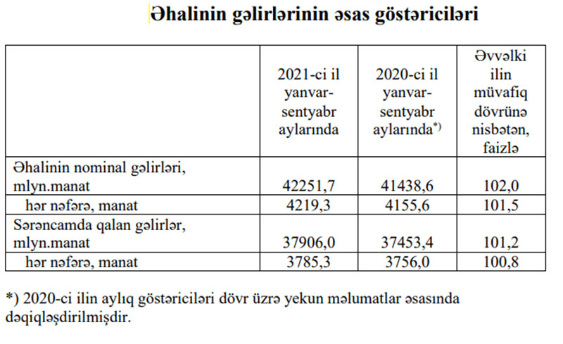 Marja Dövlət Statistika Komitəsinə istinadən xəbər verir ki, 2021-ci ilin yanvar-sentyabr aylarında ölkə əhalisinin nominal gəlirləri 42 milyard 251,7 milyon manat və ya hər nəfərə orta hesabla 4 min 219,3 manat təşkil etmişdir. Bütün icbari və könüllü ödənişlər edildikdən sonra əhalinin sərəncamında 37 milyard 906,0 milyon manatlıq vəsait qalmışdır.