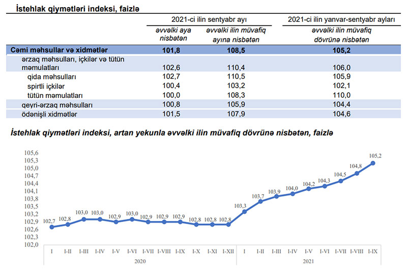 Cari ilin sentyabr ayında istehlak qiymətləri indeksi əvvəlki ilin sentyabr ayına nisbətən 108,5 faiz, 2021-ci ilin sentyabr ayında ərzaq məhsulları, içkilər və tütün məmulatları üzrə istehlak qiymətləri indeksi isə əvvəlki ilin sentyabr ayına nisbətən 10,4 faiz artıb.