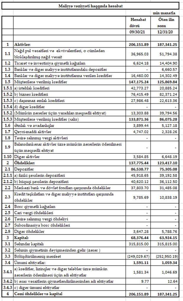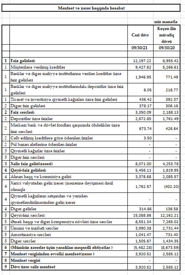 Beləliklə, 2021-ci ilin 9 ay ərzində Bankın cəmi əməliyyat gəlirləri (faiz və qeyri-faiz gəlirləri) 17 milyon 653 min manat, cəmi əməliyyat xərcləri (faiz və qeyri-faiz xərcləri) 18 milyon 438 min manat, xərclər gəlirləri üstələdiyindən əməliyyat zərəri 785 min manat təşkil edib. Mümkün zərərlər üçün yaradılan məqsədli ehtiyatlardan azad olmuş 5 milyon 482 min manat hesabına zərər bağlanıb və 3 milyon 920 min manat xalis mənfəət də formalaşıb.
