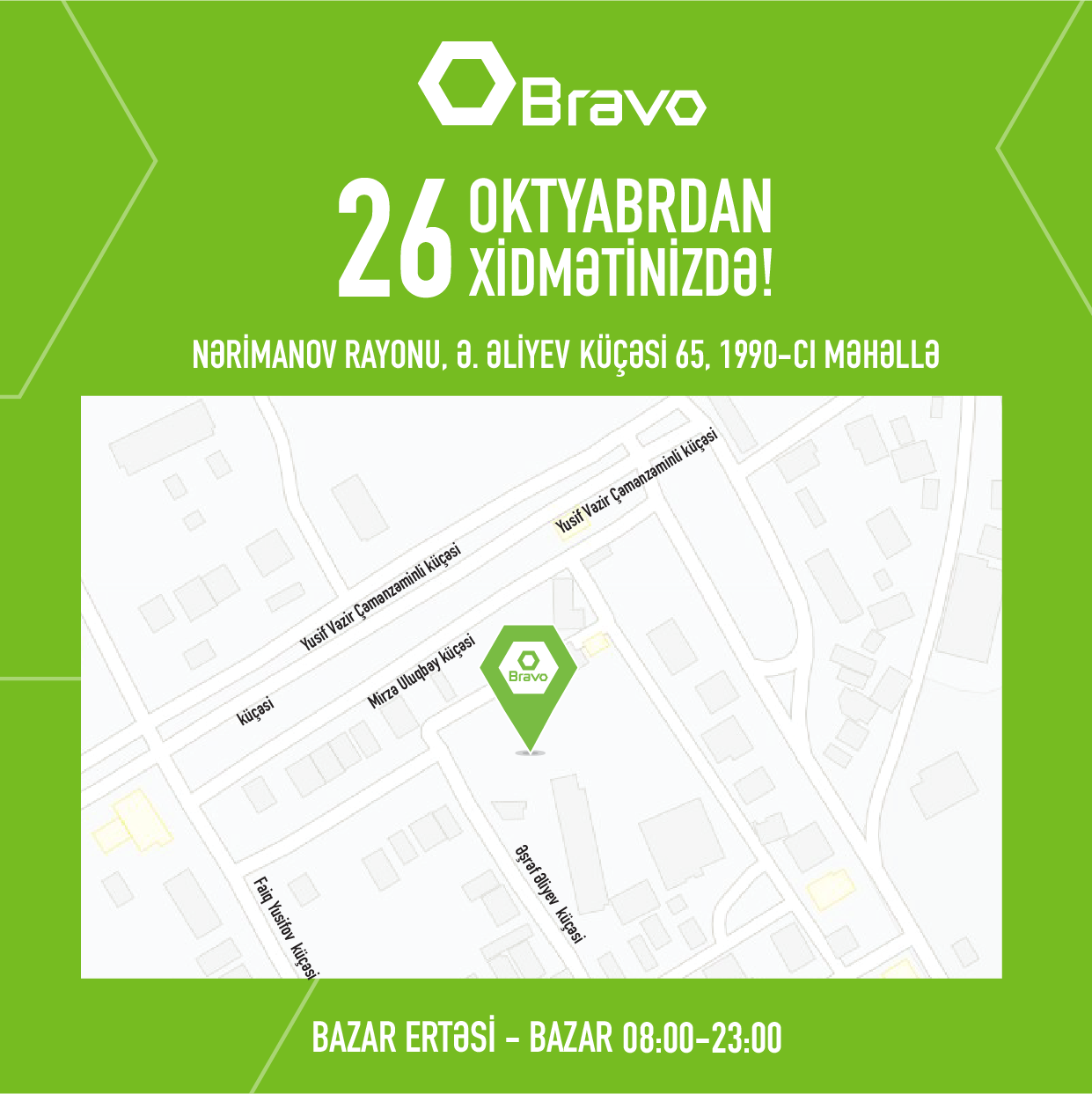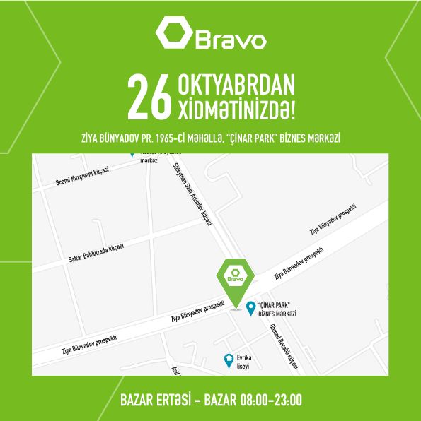Yeni BRAVO marketləri - Z.Bünyadov pr. 1965-ci məhəllə, "Çinar Park" biznes mərkəzində, Nərimanov r-nu, Ə.Əliyev küç. 65, 1990-cı məhəllədə və Xətai rayonu, Məzahir Rüstəmov küç., 26 saylı binanın yaxınlığında istifadəyə veriləcəkdir.