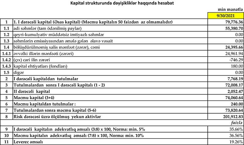 30 Sentyabr 2021-ci il tarixində “Yapı Kredi Bank Azərbaycan” 73 milyon 820 min manat məcmu kapitala malik olub. Bankın məcmu kapitalı ötən ilin sonunda 73 milyon 771 min manat təşkil etmişdi.