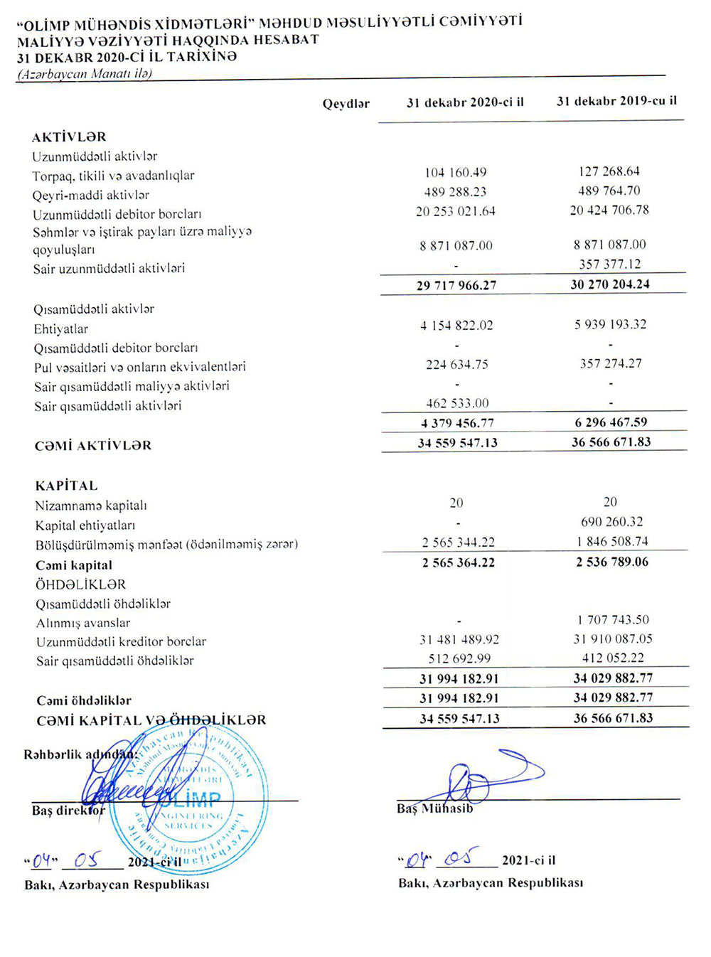 31 Dekabr 2020-ci il tarixində "Olimp Mühəndis Xidmətləri" MMC 34 milyon 560 min manat cəmi aktivlərə malik olub.