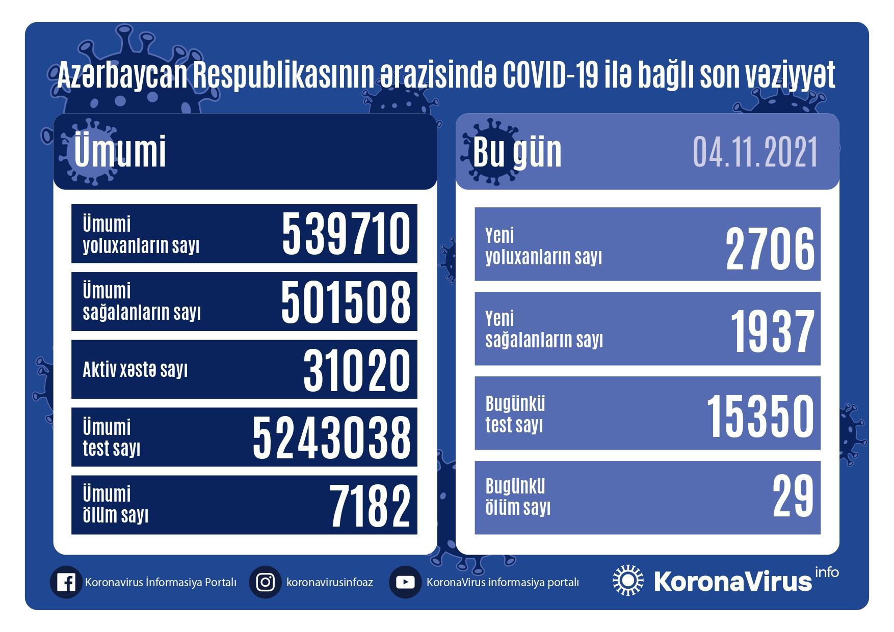 Azərbaycanda koronavirus (COVID-19) infeksiyasına 2706 yeni yoluxma faktı qeydə alınıb, 1937 nəfər müalicə olunaraq sağalıb.