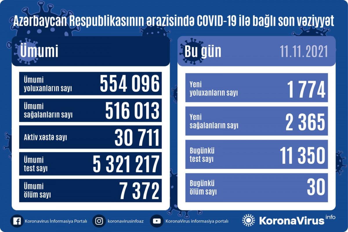 Azərbaycan Respublikasında koronavirus (COVID-19) infeksiyasına 1774 yeni yoluxma faktı qeydə alınıb, 2365 nəfər müalicə olunaraq sağalıb.
