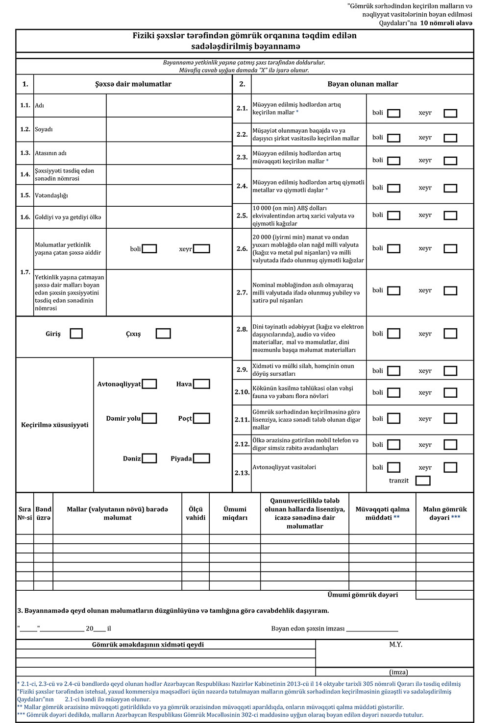 Göstərilənləri nəzərə alaraq “Gömrük sərhədindən keçirilən malların və nəqliyyat vasitələrinin bəyan edilməsi Qaydaları”nın 10 nömrəli əlavəsinin yeni formada tərtib olunmasına zərurət yaranmışdır.