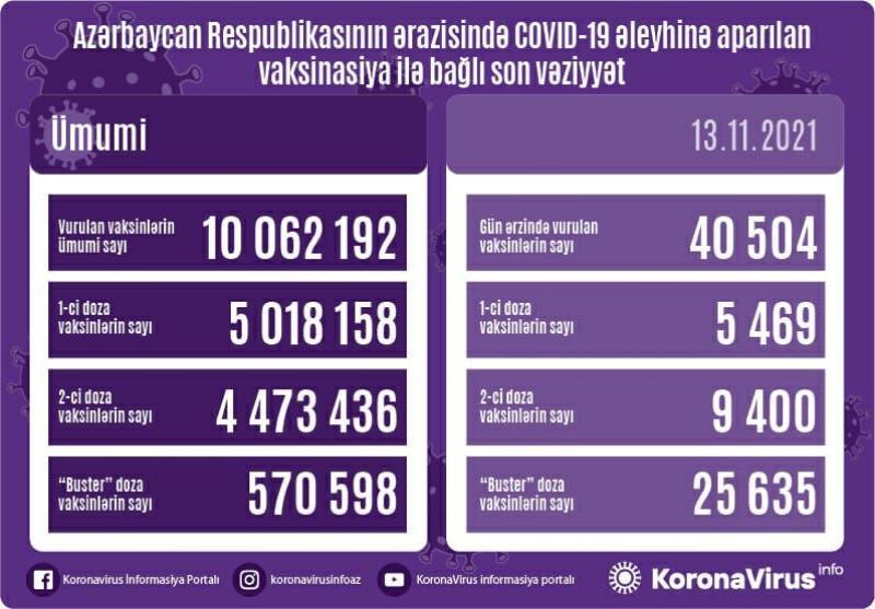 Azərbaycanda son sutkada koronavirus (COVID-19) əleyhinə 40 504 vaksin vurulub. Bir gündə birinci mərhələ üzrə vaksinasiya olunanların sayı 5 469, ikinci mərhələ üzrə vaksinasiya olunanların sayı 9 400, "buster" doza üzrə vaksinasiya olunanların sayı isə 25 635 nəfərdir.