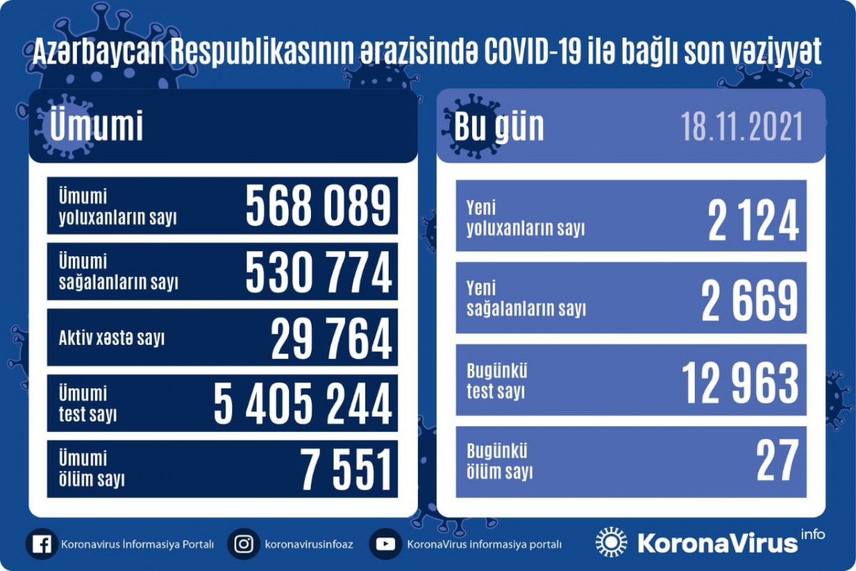 Azərbaycan Respublikasında koronavirus (COVID-19) infeksiyasına 2124 yeni yoluxma faktı qeydə alınıb, 2669 nəfər müalicə olunaraq sağalıb.