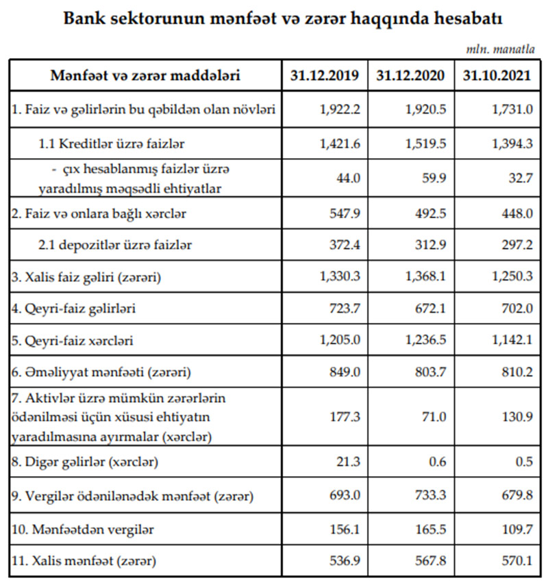 Azərbaycanın bank sektoru 2021-ci ilin yanvar-oktyabr dövrünü (10 ayı) 570,1 milyon manat xalis mənfəət ilə başa vurub. 10 aylıq xalis mənfəət sektorun 2020-ci ildə əldə etdiyi xalis mənfəətdən (567,8 milyon manat) yüksəkdir.