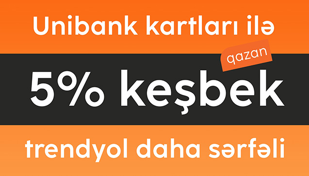 Unibankın keçirdiyi “Narıncı cümə” kampaniyası çərçivəsində 25-28 noyabr tarixində Trendyol.com saytında alış-veriş zamanı istənilən Unibank kartı ilə edilən ödənişlər müştərilərə 5% keşbek qazandıracaq. Albalı kredit kartı ilə ödəniş etdikdə isə əlavə olaraq 3 ay faizsiz taksit imkanı təqdim olunacaq.