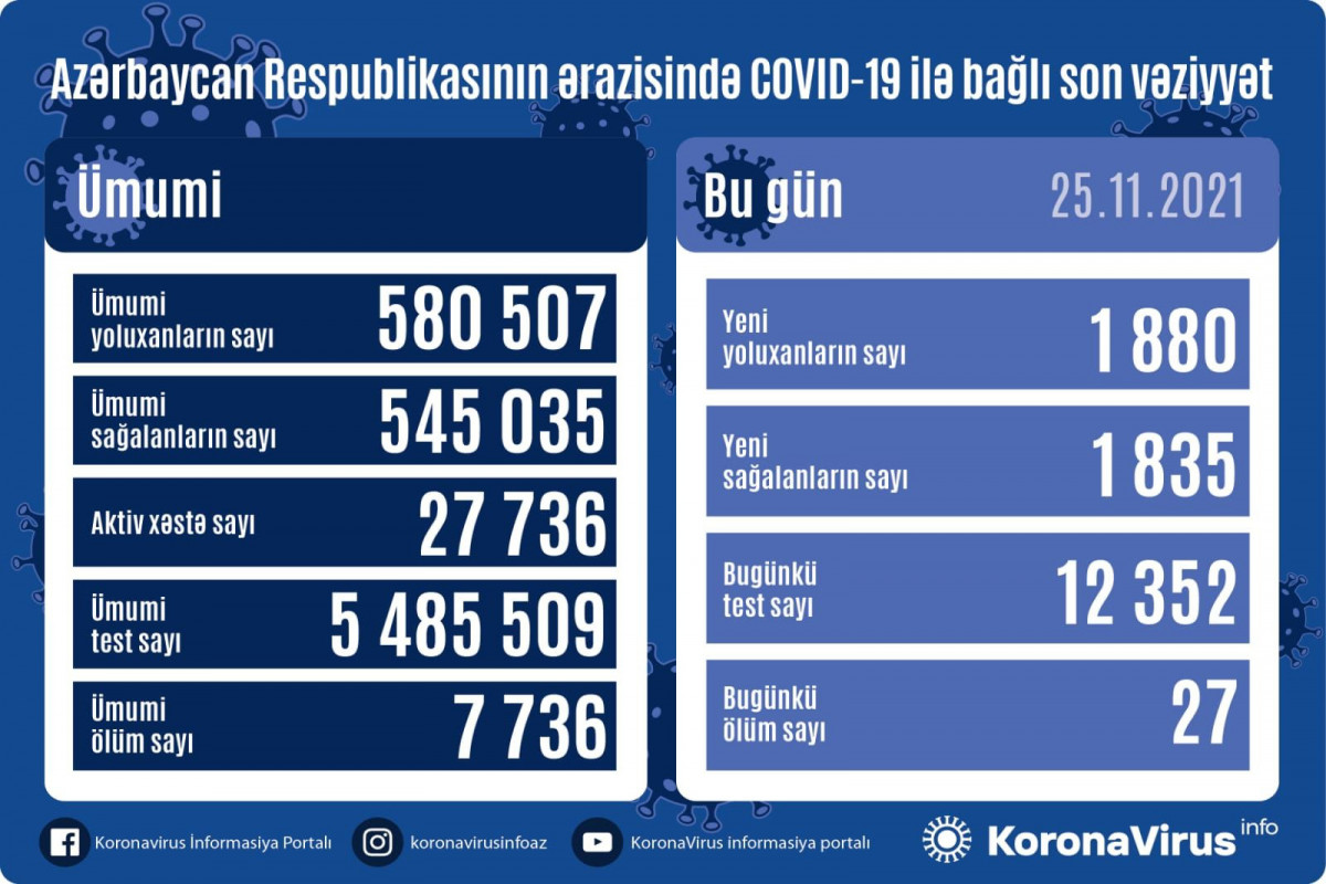 Azərbaycan Respublikasında koronavirus (COVID-19) infeksiyasına 1880 yeni yoluxma faktı qeydə alınıb, 1 835 nəfər müalicə olunaraq sağalıb.