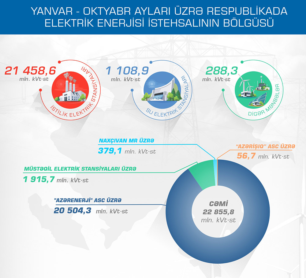 Cari ilin yanvar-oktyabr aylarında isə respublikada elektrik enerjisinin istehsalı ötən ilin müvafiq dövrü ilə müqayisədə 1554,4 mln. kVt·st artaraq 22855,8 mln kVt·st olub. Hesabat dövründə ötən ilin 10 ayına nisbətən elektrik enerjisinin istehsalı İES-lərdə 1394,8 mln. kVt·st artaraq 21458,6 mln kVt·st, SES-lərdə 162,5 mln. kVt·st artaraq 1108,9 mln. kVt·st, digər mənbələr (KES, GES və BMTYZ) üzrə isə 2,9 mln. kVt·st azalaraq 288,3 mln. kVt·st olub. Külək elektrik stansiyalarında 77,0 mln. kVt·st, günəş elektrik stansiyalarında 48,5 mln. kVt·st, Bərk Məişət Tullantılarının Yandırılması Zavodunda (BMTYZ) isə 162,8 mln. kVt·st elektrik enerjisi istehsal edilib.