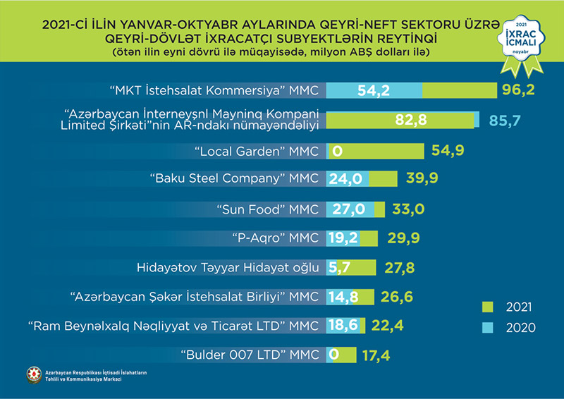 Azərbaycanın pambıq istehsalçısı "MKT İstehsalat Kommersiya" MMC 2021-ci ilin yanvar-oktyabr ayları ərzində də qeyri-dövlət ixracatçı subyektlərin reytinqində ilk yeri tutub.