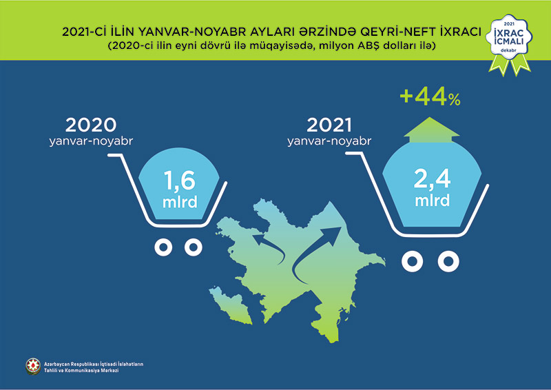 Qeyri-neft ixracı 44% artaraq 2,4 milyard ABŞ dolları təşkil edib“İxrac icmalı” nın dekabr sayına əsasən, 2021-ci ilin ilk 11 ayı ərzində Azərbaycanın ixracı 19,8 mlrd. ABŞ dolları, qeyri-neft sektoru üzrə 2,4 mlrd. ABŞ dolları təşkil edib.