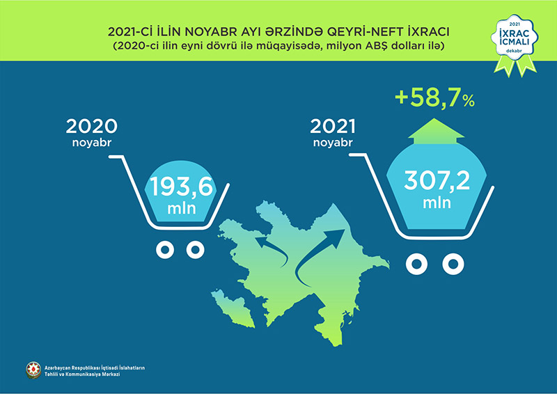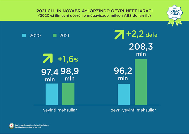 Normallaşma prosesinin davam etdiyi dövrdə noyabr ayı üzrə ixrac 2,95 mlrd ABŞ dolları təşkil edib. Qeyri-neft sektoru üzrə ixracda artım 58,7% təşkil etməklə 307,2 mln ABŞ dolları olub. 2021-ci ilin noyabr ayı ərzində yeyinti məhsulları üzrə ixrac ötən ilin müvafiq ayı ilə müqayisədə 1,6% artaraq 98,9 milyon ABŞ dolları, qeyri-yeyinti məhsulları üzrə isə 2,2 dəfə artaraq 208,3 milyon ABŞ dolları təşkil edib.