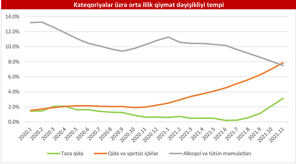 Qeyd edək ki, 2021-ci ilin noyabr ayında təzə qida məhsullarının (qısamüddətli istifadəyə yararlı istehlak məhsulları) qiymətində 2020-ci ilin noyabr ayına nisbətən 10,6%, qida və spirtsiz içkilərdə 12,5%, alkoqol və tütün məmulatlarında isə 6,2% artım müşahidə edilib.