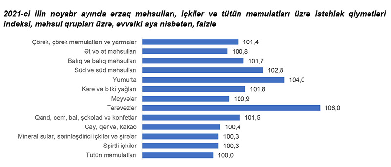 2021-ci ilin noyabr ayında ərzaq məhsulları, içkilər və tütün məmulatları üzrə istehlak qiymətləri indeksi əvvəlki aya nisbətən 1,9 faiz, əvvəlki ilin noyabr ayına nisbətən 14,9 faiz yüksəlib.
