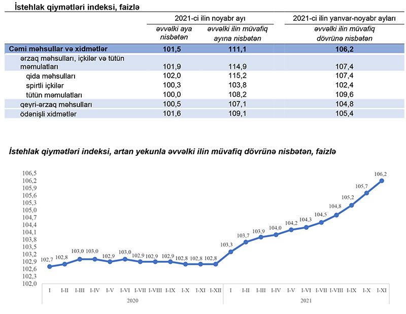 Azərbaycanda illik inflyasiya 5,7%-dən 6,2%-ə sürətlənib. Ərzaq qiymətləri son 12 ayda 15%-ə yaxın artıb.2021-ci ilin yanvar-noyabr aylarında istehlak qiymətləri indeksi (inflyasiya göstəricisi) 2020-ci ilin yanvar-noyabr aylarına nisbətən 6,2 faiz, o cümlədən ərzaq məhsulları, içkilər və tütün məmulatları üzrə 7,4 faiz, qeyri-ərzaq məhsulları üzrə 4,8 faiz, əhaliyə göstərilmiş ödənişli xidmətlər üzrə 5,4 faiz artıb.