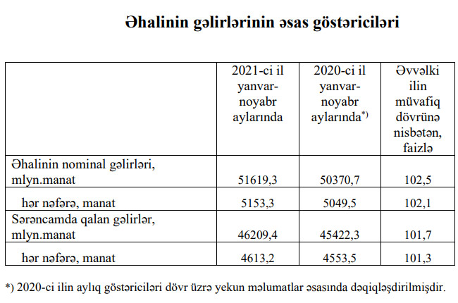 Əhalinin gəlirləri nominal ifadədə 2,5 faiz, qiymətlər isə 6,2 faiz artıb.İlkin məlumatlara görə, 2021-ci ilin yanvar-noyabr aylarında ölkə əhalisinin nominal gəlirləri 51 milyard 619,3 milyon manat və ya hər nəfərə orta hesabla 5 min 153,3 manat təşkil etmişdir.