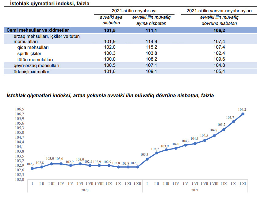 2021-ci ilin noyabr ayında istehlak qiymətləri indeksi (inflyasiya göstəricisi) oktyabr ayı ilə müqayisədə 1,5 faiz, 2021-ci ilin yanvar-noyabr aylarında əvvəlki ilin müvafiq dövrü ilə müqayisədə isə 6,2 faiz artıb.