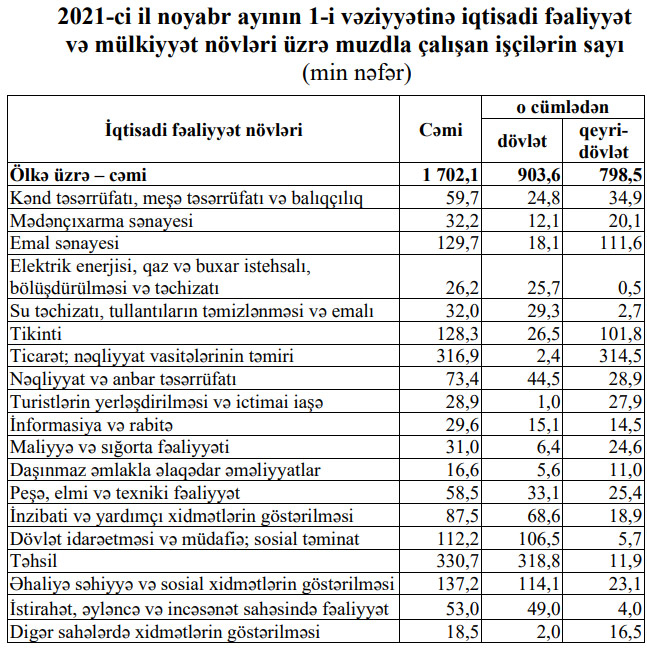 İqtisadiyyatın neft-qaz sektorunda 31,6 min nəfər, qeyri neft-qaz sektorunda isə 1 milyon 670,5 min nəfər çalışmışdır.