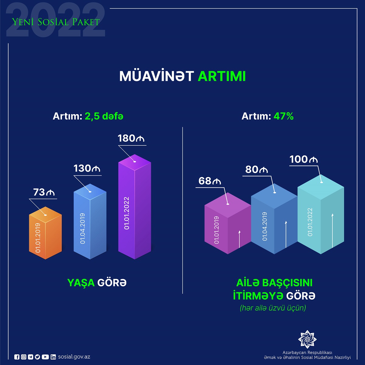 Belə ki, 2022-ci ilin 1 yanvarından yaşa görə müavinət 130 manatdan 180 manata çatdırılır. 2019-cu ilin əvvəlində bu müavinət 73 manat idi, ümumilikdə 2,5 dəfə artırılmaqla gələn ilin əvvəlindən 180 manat təşkil edəcək. Bununla da 2022-ci ildə pensiyaçılar üçün nəzərdə tutulan yaşayış minimumunu (176 manat) üstələyəcək.