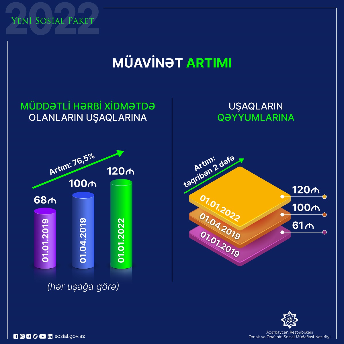 Müddətli hərbi xidmətdə olan hərbçilərin uşaqlarına müavinət üç il əvvəl 68 manat, 2019-cu ilin aprelindən 100 manata çatdırılıb. Yeni Fərmanla isə 2022-ci ilin əvvəlindən 120 manat təşkil edəcək. Son üç ildə bu müavinət 76,5% artırılıb.