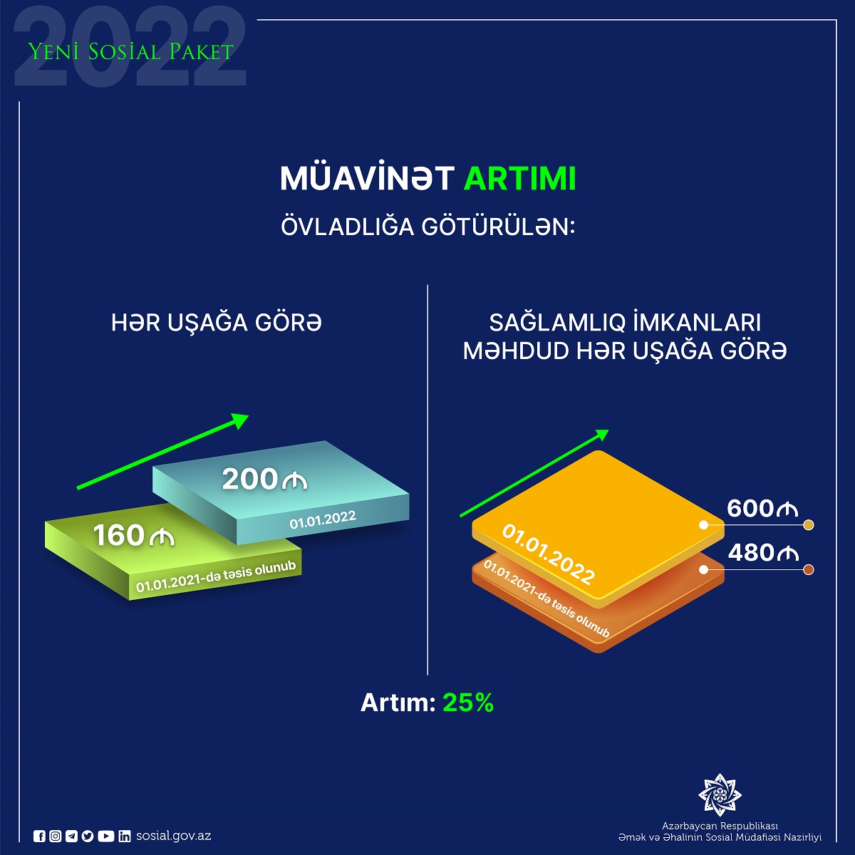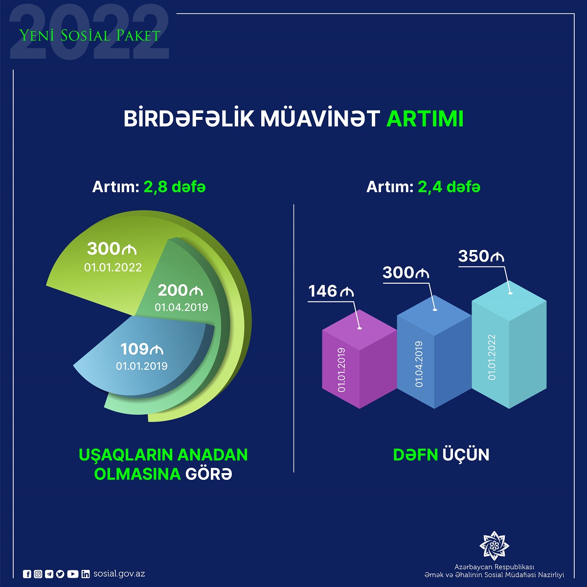 Uşağın anadan olmasına görə birdəfəlik müavinət 200 manatdan 300 manata çatdırılıb. Bu müavinət üç il əvvəlki məbləğlə (109 manat) müqayisədə 2,8 dəfə artırılıb.