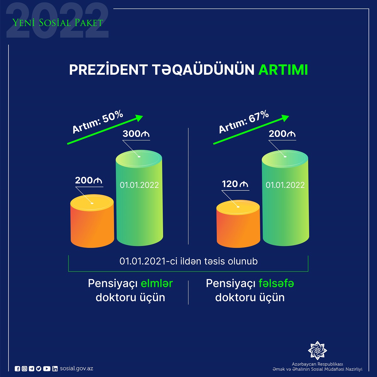 Marja xəbər verir ki, azı 25 il pedaqoji staja malik, işləməyən pensiyaçı olan elmlər doktorları və fəlsəfə doktorlarına 2021-ci il yanvarın 1-dən Prezidentin aylıq təqaüdü təsis olunub. Yeni Fərmanla bu təqaüd elmlər doktorları üçün 50% artırılaraq 200 manatdan 300 manata, fəlsəfə doktorları üçün 67% artırılaraq 120 manatdan 200 manata çatdırılır.