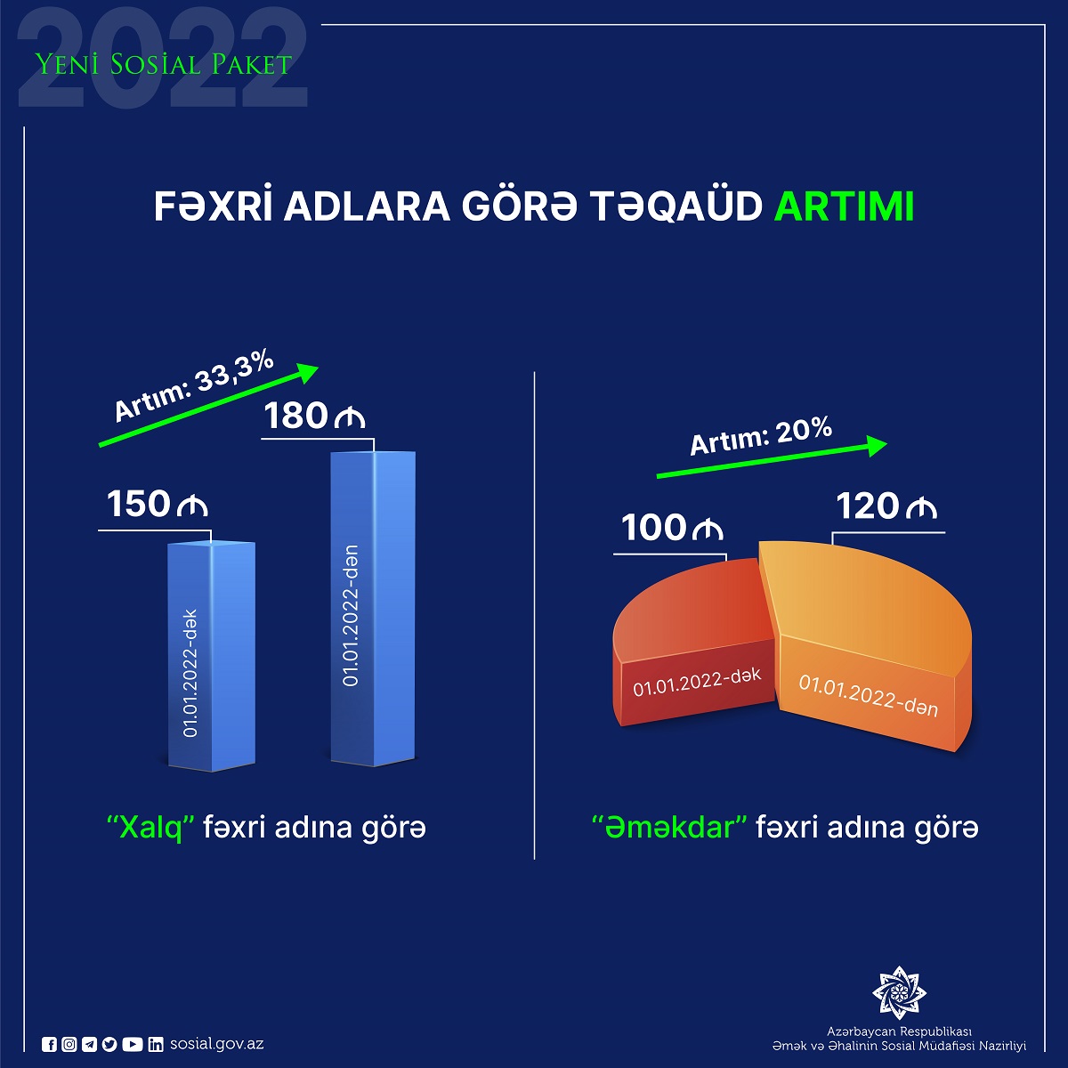 Bu gün imzalanan yeni Sərəncamla fəxri adlara görə aylıq təqaüdlər də “Xalq” fəxri adına görə 33,3% artımla 150 manatdan 180 manata, “Əməkdar” fəxri adına görə isə 20% artımla 100 manatdan 120 manata çatdırılıb.