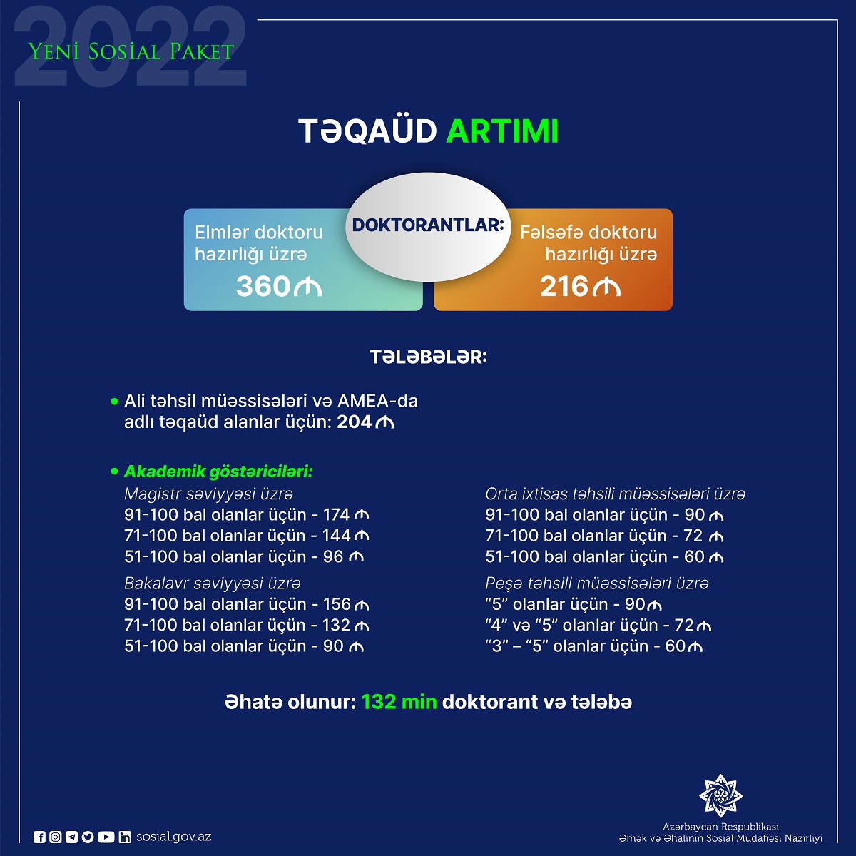 Kimlərin müavinətləri artdı?Sərəncamla gələn ilin əvvəlindən həmin təqaüdlərin məbləği elmlər doktoru hazırlığı üzrə doktorantlar üçün 360 manat, fəlsəfə doktoru hazırlığı üzrə doktorantlar üçün 216 manat, ali təhsil müəssisələrində və AMEA-da adlı təqaüd alan tələbələr üçün 204 manat, magistr səviyyəsi üzrə akademik göstəriciləri 91-100 bal olan tələbələr üçün 174 manat, 71-100 bal olan tələbələr üçün 144 manat, 51-100 bal olan tələbələr üçün 96 manat, bakalavr səviyyəsi üzrə akademik göstəriciləri 91-100 bal olan tələbələr üçün 156 manat, 71-100 bal olan tələbələr üçün 132 manat, 51-100 bal olan tələbələr üçün 90 manat təşkil edəcək.