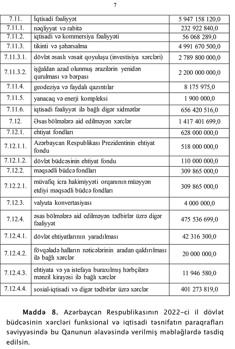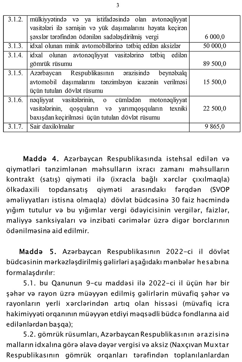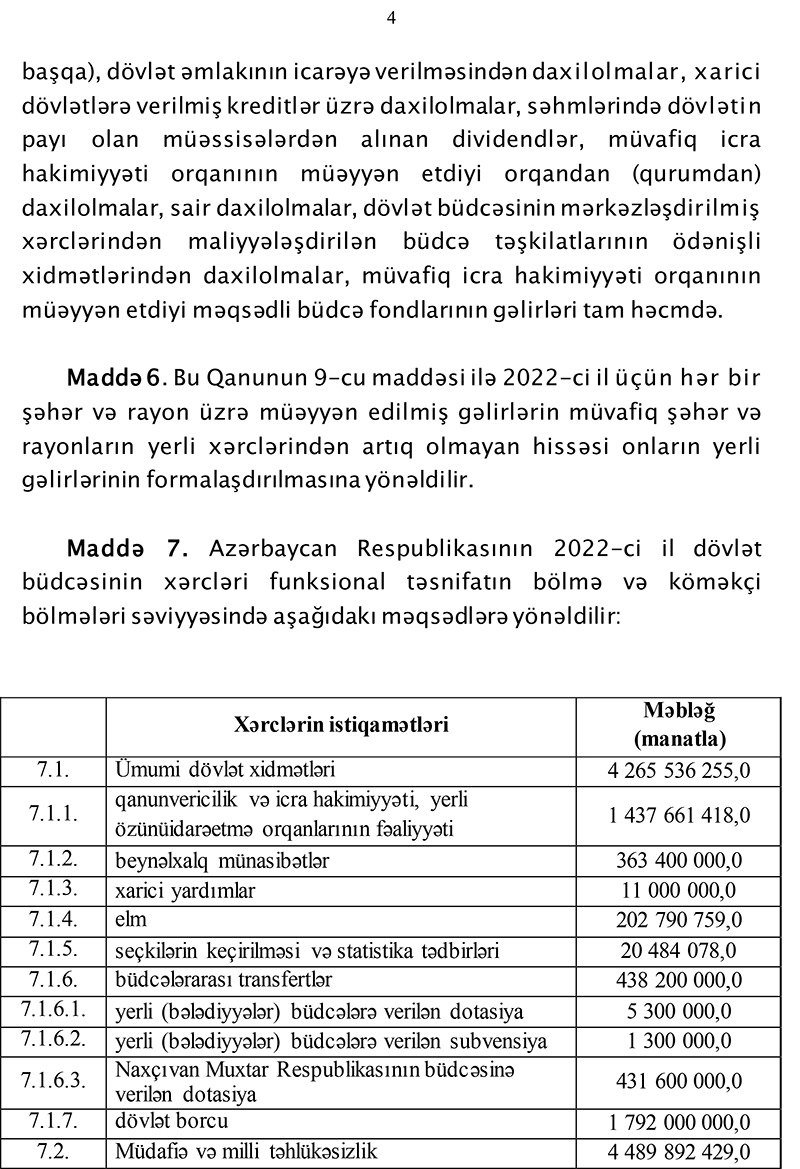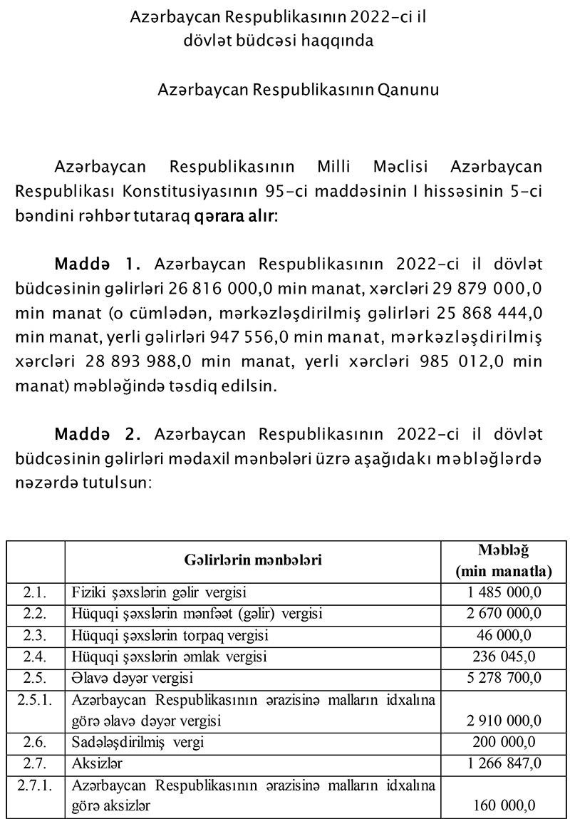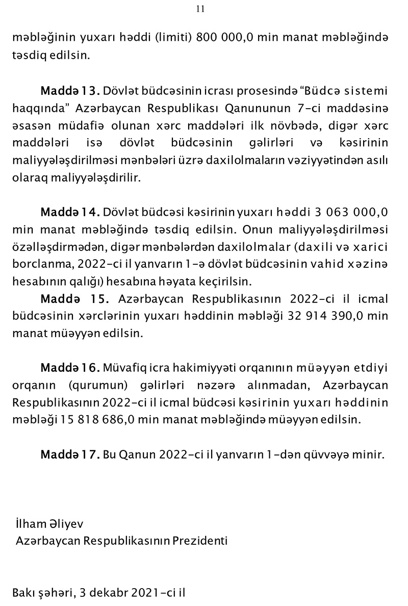 Azərbaycan Respublikasının Prezidenti İlham Əliyev “Azərbaycan Respublikasının 2022-ci il dövlət büdcəsi haqqında” Azərbaycan Respublikasının qanunu imzalayıb.